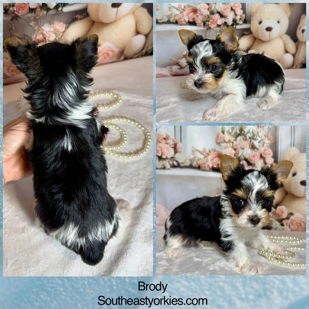 CKC Male Parti Yorkie. Born Jan. 27, 2026. Will be vet checked and up to date on shots. Tail dock and dew claws have been removed. Charting around 5 lbs. Ready March 17, 2026.